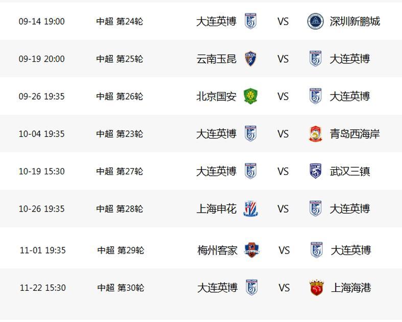 对于争冠和保级球队来说,大连英博也是生死判官!9月14日第24轮,大连英博VS深圳新鹏城,9月26日第26轮,国安VS大连;10月19日第27轮,大连英博VS武汉三镇,10月26日第28轮,上海申花VS大连英博;11月1日第29轮,梅州客家VS大连英博,11月22日第30轮,大连英博VS上海海港。